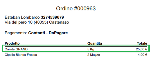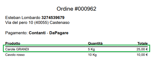 Prendiamo in esame un esempio concreto. I due ordini seguenti hanno in comune le Carote GRANDI. Sono stati ordinati 5 kg nel primo ordine (#000962) e altri 5 Kg nel secondo (#000963) per un totale di 10 Kg.